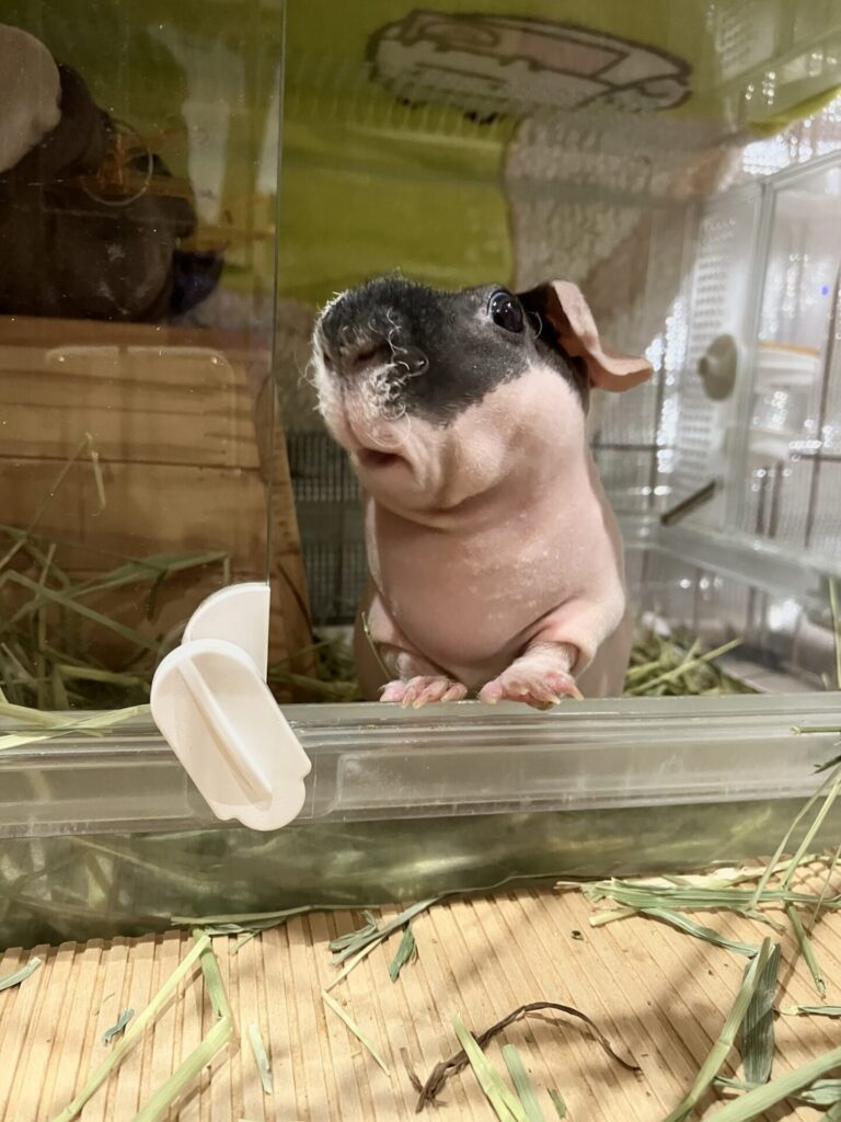 モルモット(スキニーギニアピッグ)は個体差はありますが、人に慣れやすく、飼い主の気配をよく覚えます。